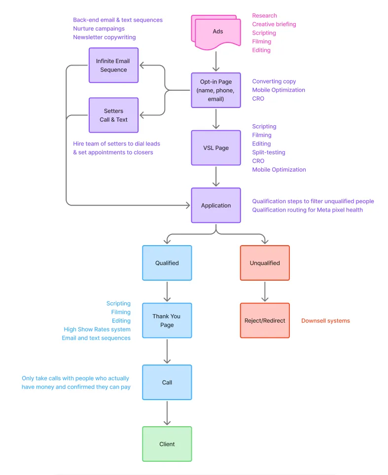Most failed ad experiments fail because of a bad offer, bad messaging, disjointed funnel, generic copy, or poor tracking. We start with a deep audit to identify the underlying issues and fix them before we launch anything. Then we build a cold traffic ready offer to launch campaigns with a focus on profitable unit economics and qualified booked appointments—not just volume. We also track show rates and close rates, not just lead volume.